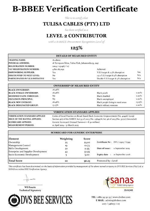 Tulisa Cables is verified for Broad Based Black Economic Empowerment in accordance with the codes of good practice issued under Section 9(1) of the BBBEE Act No. 53 of 2003 as amended on 11 October 2013.